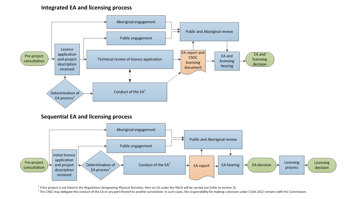- all licence applications that demonstrate potential interactions between the facility or activity and the environment are subject to an environmental assessment (EA), either under the NSCA or under the Canadian Environmental Assessment Act, 2012 (CEAA 2012)