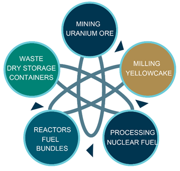 The nuclear fuel cycle starts with uranium mining, followed by the processing of uranium into fuel for nuclear power plants. After the fuel has been used in nuclear reactors, the CNSC also regulates the safe management of the nuclear waste. Beyond the fuel cycle, the CNSC monitors and ensures the safe use of nuclear materials in medicine, research and other industries.