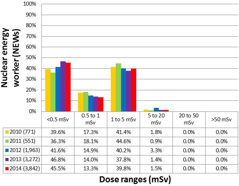In 2014, workers' occupational exposures to radiation continued to be very low. More than 99.9% of the 60,407 workers received doses below their applicable regulatory dose limits. This followed a trend consistent with previous reporting years. No NEWs exceeded the one- or five-year dose limits of 50 millisieverts (mSv) or 100 mSv, respectively.