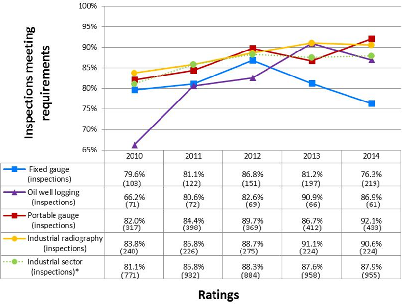 In 2014, the CNSC conducted 1,453 inspections across the four nuclear industry sectors (medical, industrial, academic and research, and commercial) and the two high-energy research particle accelerator facilities. Licensees showed satisfactory compliance ratings in the operating performance, radiation protection and security SCAs. Non-compliances identified during inspections are systematically tracked until licensees have addressed them to the satisfaction of the CNSC.