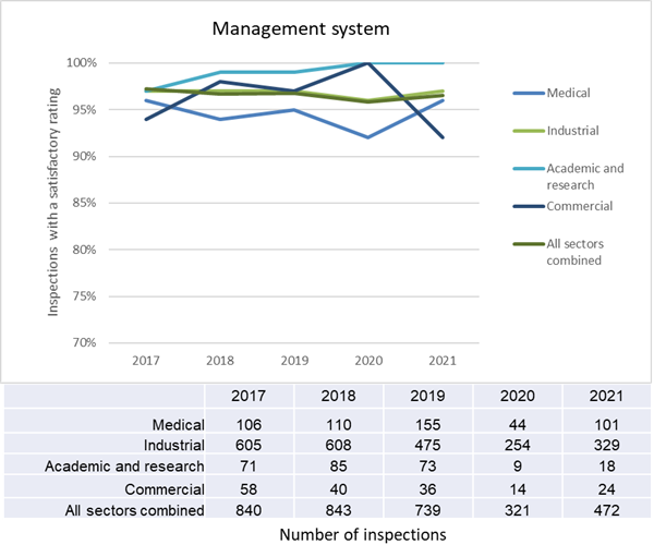 Overall, in 2021, licensees maintained similar ratings compared to previous years, with 83% of inspections resulting in satisfactory ratings in the radiation protection SCA. While the medical and industrial sector ratings were similar to previous years, both the academic and research sector and the commercial sector demonstrated a decline in performance. In particular, the academic and research sector showed a significant decline in performance, with only 78% of 23 inspections performed yielding a satisfactory rating in the radiation protection SCA in 2021 compared to 100% of the 10 inspections performed in 2020. As noted earlier, these performance results are an indicator that CNSC staff factor into their inspection planning. However, while 5 of the 23 inspections performed received a below expectations rating in 2021, it represents only a small proportion of the 187 licences in the sector, making it difficult to confirm whether this is representative of the entire sector.