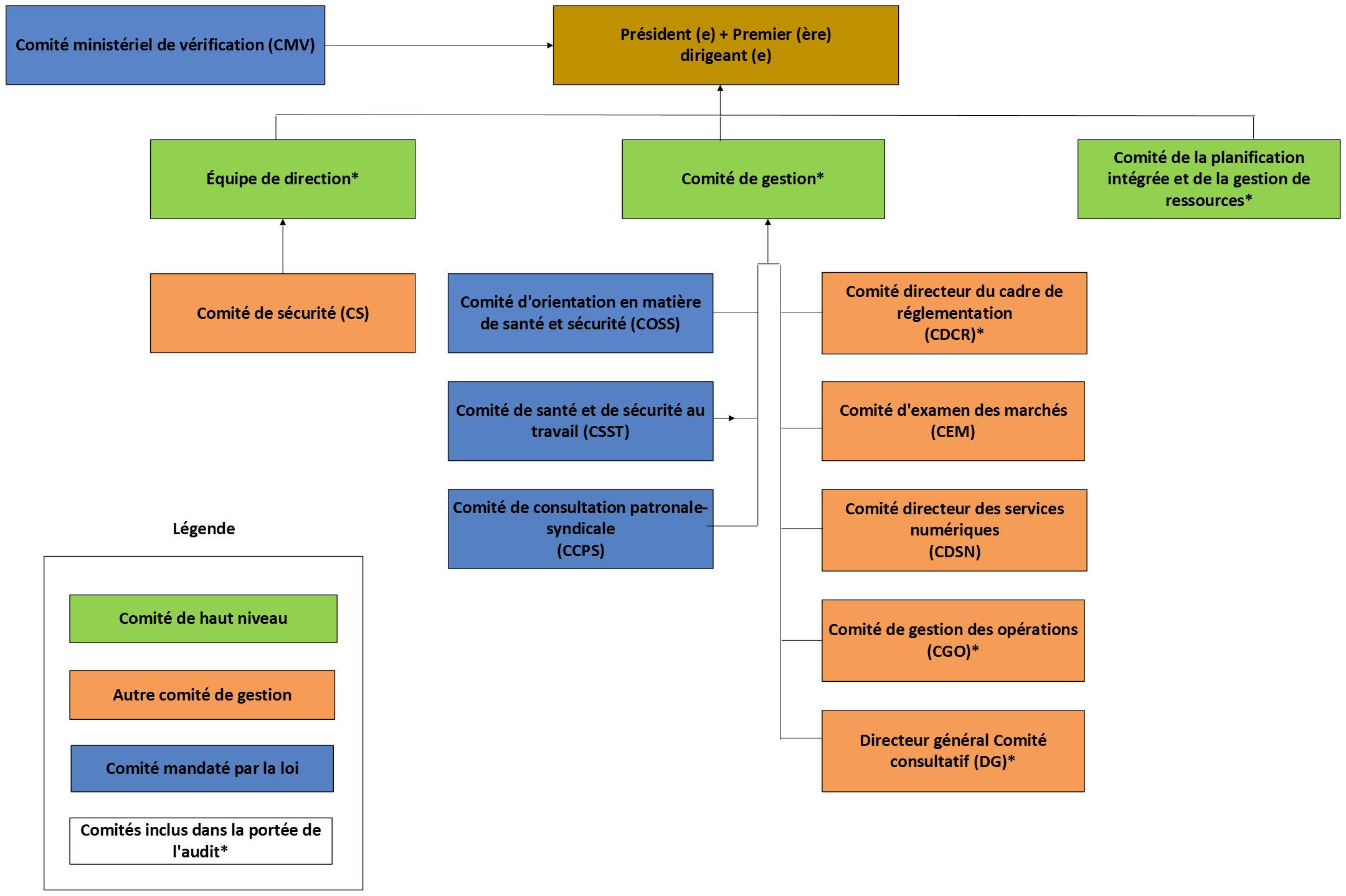 - Le Comité ministériel de vérification est un comité mandaté par la loi et ne s’inscrit pas dans la portée de l’audit. Il relève du président et premier dirigeant.