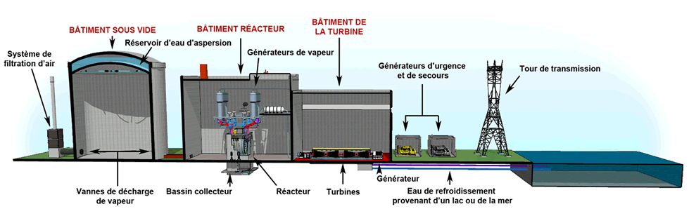 La centrale comprend trois grands bâtiments, c’est-à-dire le bâtiment sous vide, le bâtiment réacteur et le bâtiment de la turbine. Dans l’image, des flèches pointent vers les principaux composants de la centrale et l’endroit où elles se situent. Le bâtiment sous vide abrite le réservoir d’eau d’aspersion et les vannes de décharge de vapeur. Le bâtiment réacteur abrite les générateurs de vapeur, le réacteur et le bassin collecteur, situé dans le sous-sol du bâtiment. Le bâtiment de la turbine est quant à lui relié au bâtiment réacteur. On voit aussi les turbines, le générateur et le condensateur qui refroidit l’eau provenant d’un lac ou de la mer. À l’extérieur de la centrale, on trouve le système de filtration d’air, à côté du bâtiment sous vide. Les générateurs d’urgence et de secours et une tour de transmission sont également à l’extérieur. Grande image