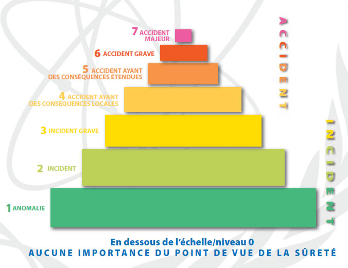 Dès que survient un événement nucléaire ou radiologique, il est classé selon l'échelle INES, dont le niveau le plus élevé est 7. L'échelle tient compte des impacts sur la population et l'environnement, des barrières et contrôles radiologiques, ainsi que des couches multiples de la défense en profondeur faisant partie intégrante de la conception des réacteurs nucléaires.