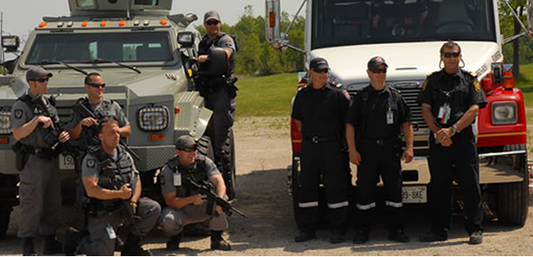 L'équipe des services d'urgence de Bruce Power se fait prendre en photo. La CCSN exige des exploitants de centrale nucléaire qu'ils aient une équipe de lutte contre l'incendie et une équipe d'intervention tactique afin de répondre aux divers incidents qui pourraient se produire sur le site. Kincardine (Ontario) Canada