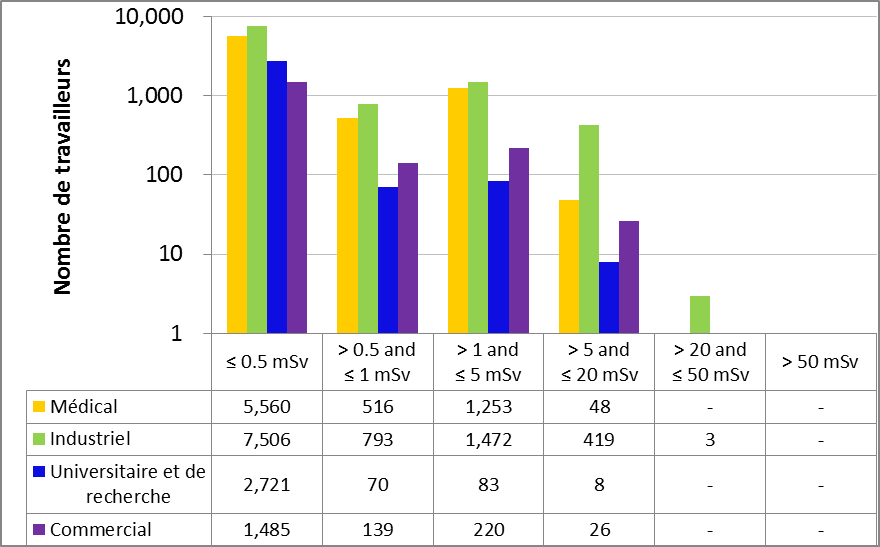 Le présent rapport mentionne deux groupes de travailleurs qui effectuent les types de travaux cités dans un permis de la CCSN : ceux désignés comme travailleurs du secteur nucléaire et ceux n’étant pas désignés comme travailleurs du secteur nucléaire. L’expression « travailleur du secteur nucléaire » désigne une personne qui, du fait de sa profession ou de son occupation et des conditions dans lesquelles elle exerce ses activités, si celles-ci sont liées à une substance ou à une installation nucléaire, risque vraisemblablement de recevoir une dose de rayonnement supérieure à 1 millisievert (mSv) par année. Un travailleur n’étant pas désigné comme travailleurs du secteur nucléaire signifie une personne qui, lorsque qu’elle exécute des tâches liées à une substance nucléaire ou à une installation nucléaire, ne recevra vraisemblablement pas une dose dépassant 1 mSv par année. Ce rapport présente l’information dosimétrique concernant tous les travailleurs, tout en se concentrant principalement sur ceux désignés comme travailleurs du secteur nucléaire.